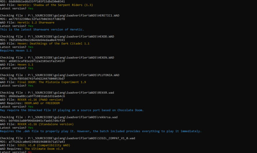 WADverifier is a small Command Line Interface tool written in Golang. It is used to quickly check if a DOOM-Engine based IWAD is valid or not, and up to date. Optionally, WADVerifier can also check through a json file to check the validity of some PWAD files, if a list is specified.